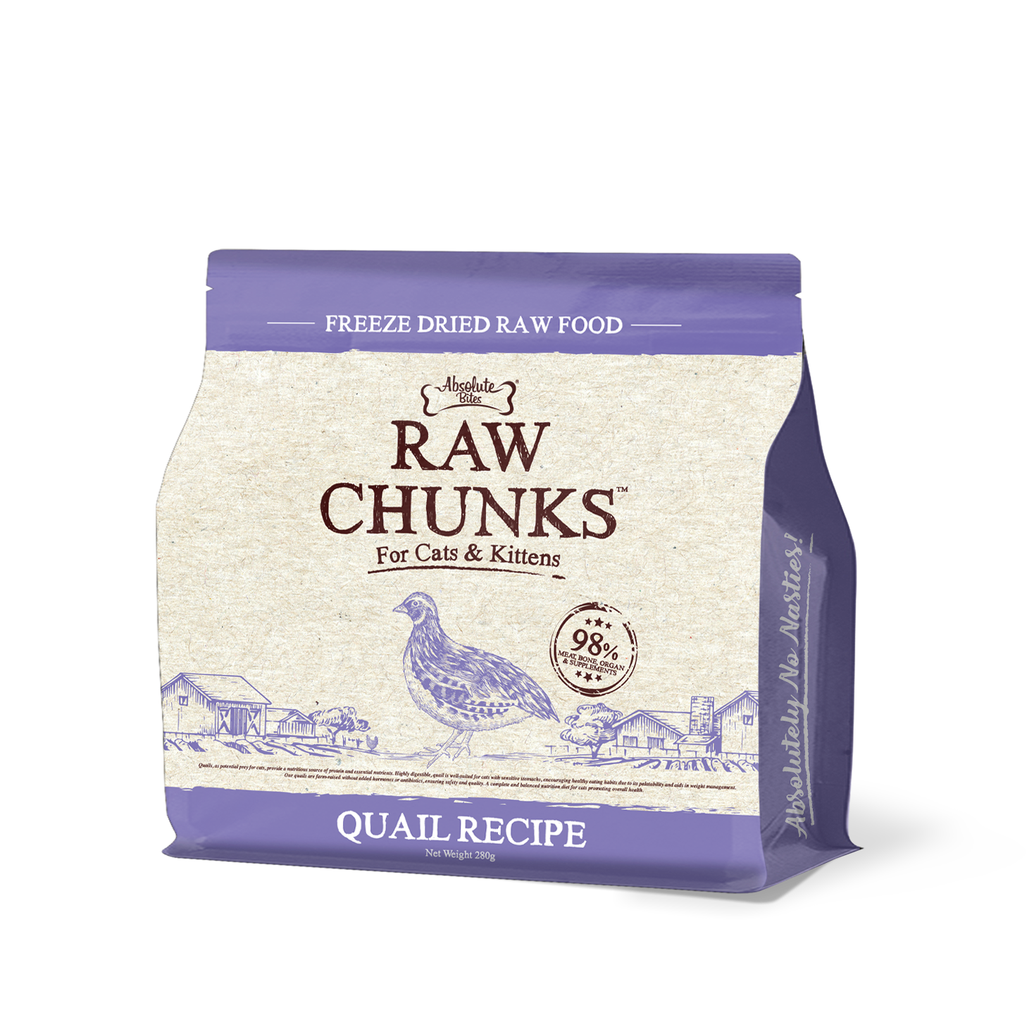 Absolute Bites® Raw Chunks Quail Recipe For Cats & Kittens is formulated to meet the nutritional levels established by the AAFCO Cat Food Nutrient Profiles for all life stages.