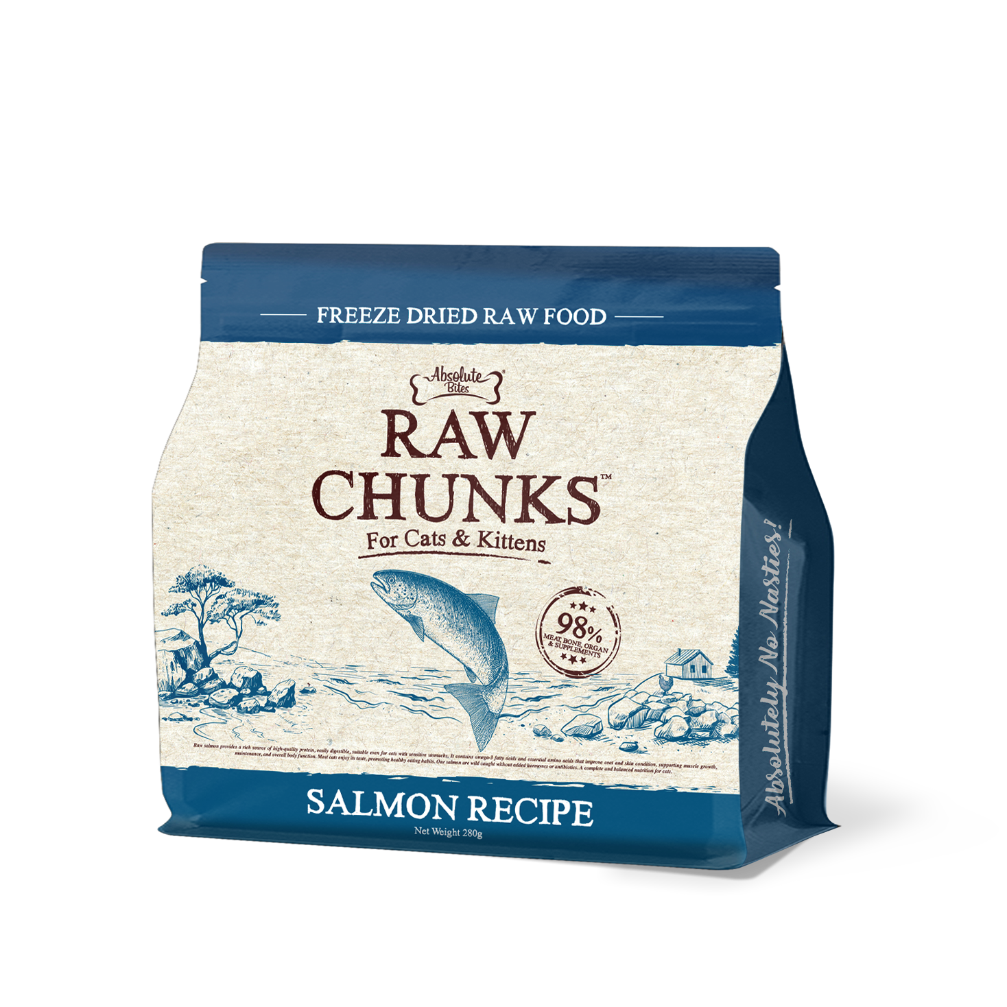 Absolute Bites® Raw Chunks Salmon Recipe For Cats & Kittens is formulated to meet the nutritional levels established by the AAFCO Cat Food Nutrient Profiles for all life stages.